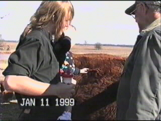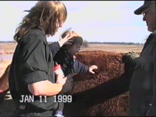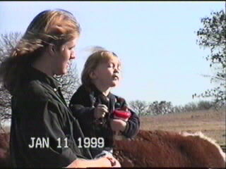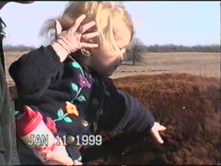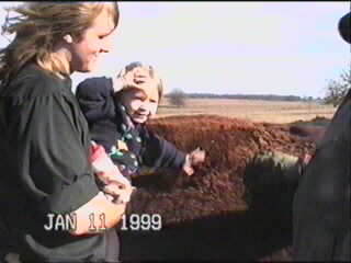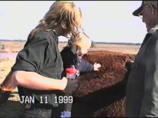 Here you get to see Madison actually petting a cow. Great-grandpa Ralph threw out some pellets for them and pointed us towards the most people friendly one. As you can tell from the photos, the wind was really blowing that day. All you can hear on this section of the videotape is the wind whipping across the microphone.